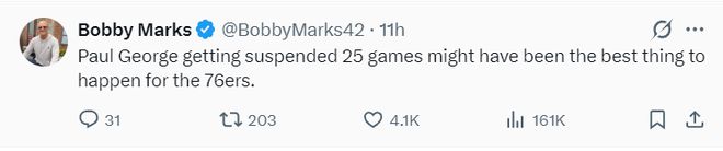 ESPN记者鲍比-马克斯写道:保罗-乔治被禁赛25场,可能反而是76人发生的最好的一件事。