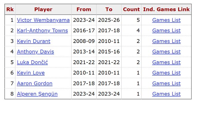文班今日22岁88天,此战砍下41分18板后,他连续2场达成40分15板壮举(上一场对阵公牛他砍下41分16板4助3帽),常规赛生涯第5次达成40分15板壮举,他超越了唐斯的4次,成为现役球员23岁前砍下40分15板次数最多之人,唐斯变成了现役第二。