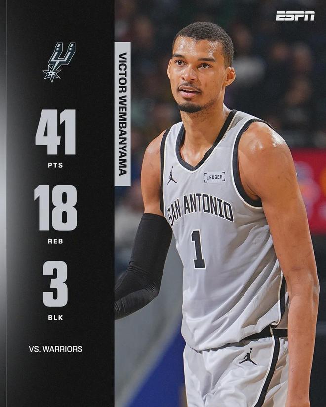 文班亚马连续两场40+两双,为马刺队史首人,强如邓肯都未曾做到过,同时是NBA史上连续两场至少40分10板的最年轻球员,这位来自外星球的怪物,在年仅22岁的年龄就要开启属于自己的一个时代。