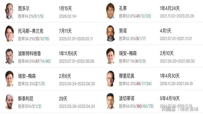 有趣的是,排名第一的阿勒代斯,执教利兹联只有短短31天,而且在英格兰代表队也仅仅执教一场,胜率百分之一百,很快就下课,同时创造了俱乐部和国家队最短的纪录,十分难得。排名第二的,热刺球迷也相当熟悉,波斯特科格鲁本赛季在诺丁汉森林只停留了40天,一场不胜。