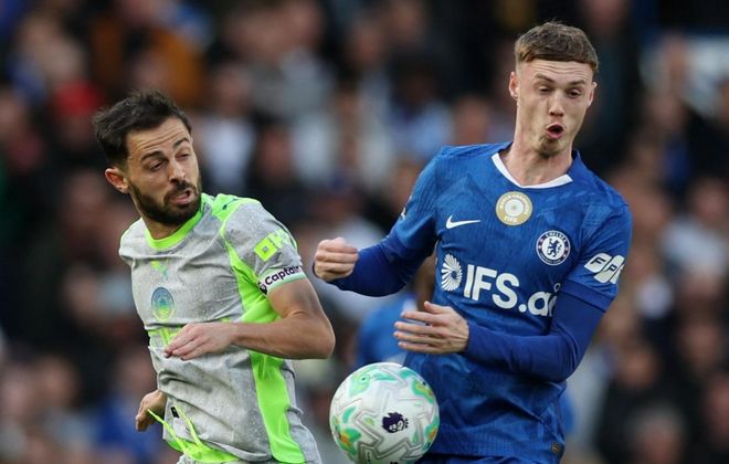 比赛开始后不久,格伊头球攻门,被化解了。之后切尔西接连创造出机会。但是,帕尔默和若昂-佩德罗的射门都踢偏了。库库雷利亚虽然把握住了机会取得进球,却因为越位被吹掉。伯纳多-席尔瓦的射门被门将神勇化解。半场结束,比分依然是0-0。曼城上半场控球率66%,但只有5次射门,2次射正,没能进球。切尔西上半场也是5次射门,同样没有进球。