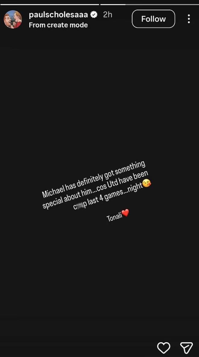 在英超第29轮比赛中,曼联客场1-2惨遭10人作战的纽卡斯尔绝杀,卡里克也迎来了他执教球队的首场失利。在比赛结束后,曼联名宿、曾经与卡里克并肩作战多年的斯科尔斯公开炮轰老友,直言其治下的曼联表现“烂透了”。他在一条Instagram快拍中连夜写道:“卡里克身上绝对有什么‘特别之处’,毕竟曼联过去四场比赛烂透了……晚安。”斯科尔斯甚至还配了一个亲吻表情,随后写下“托纳利”,并在这位纽卡斯尔球星名字后面加了一颗爱心。