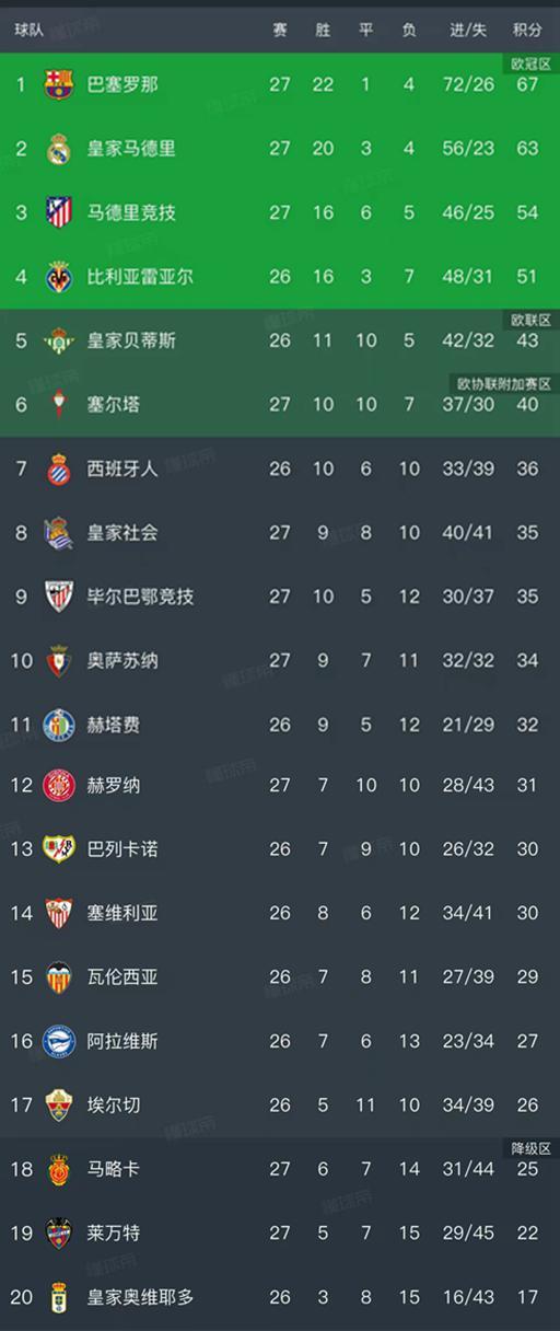 西甲最新积分榜